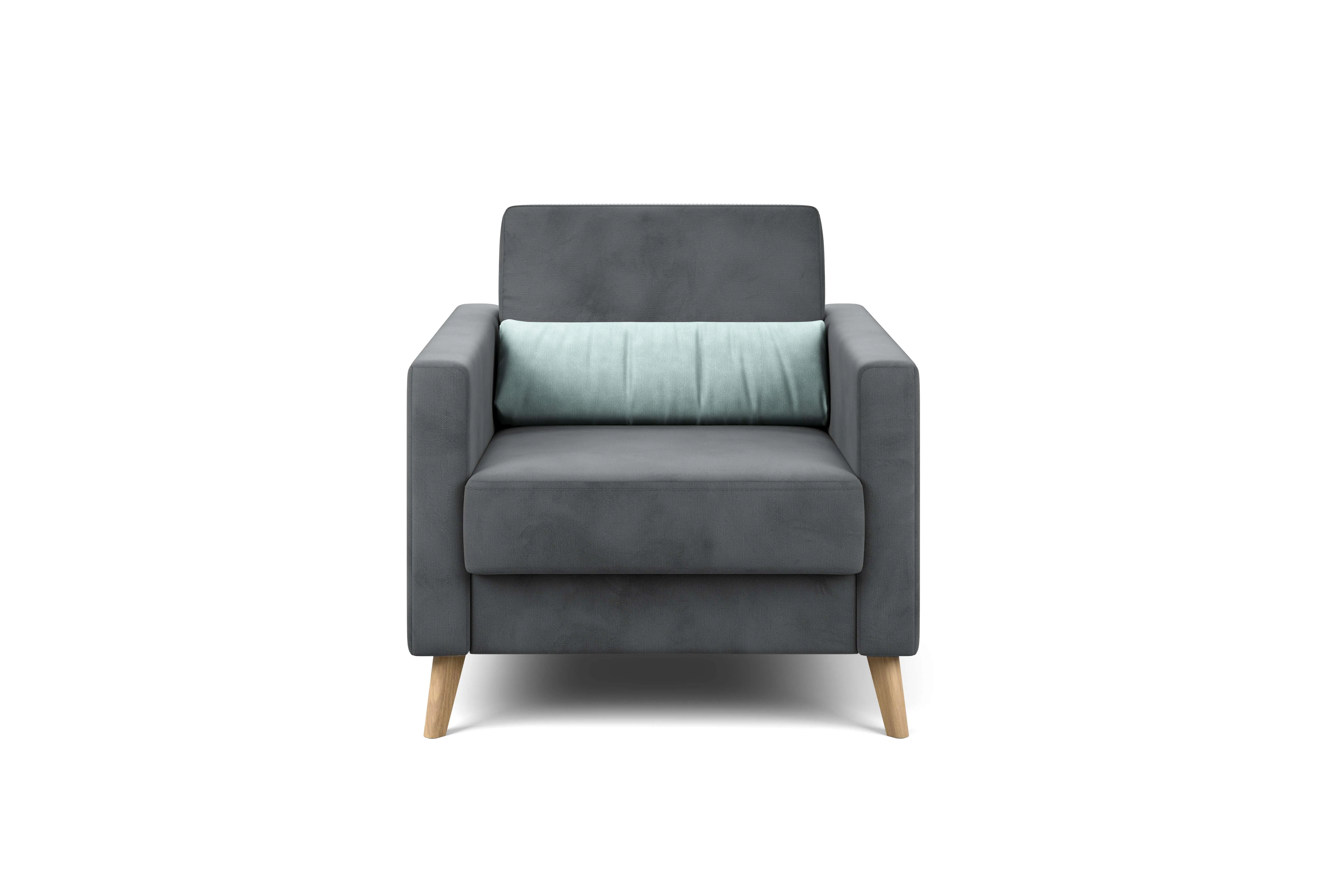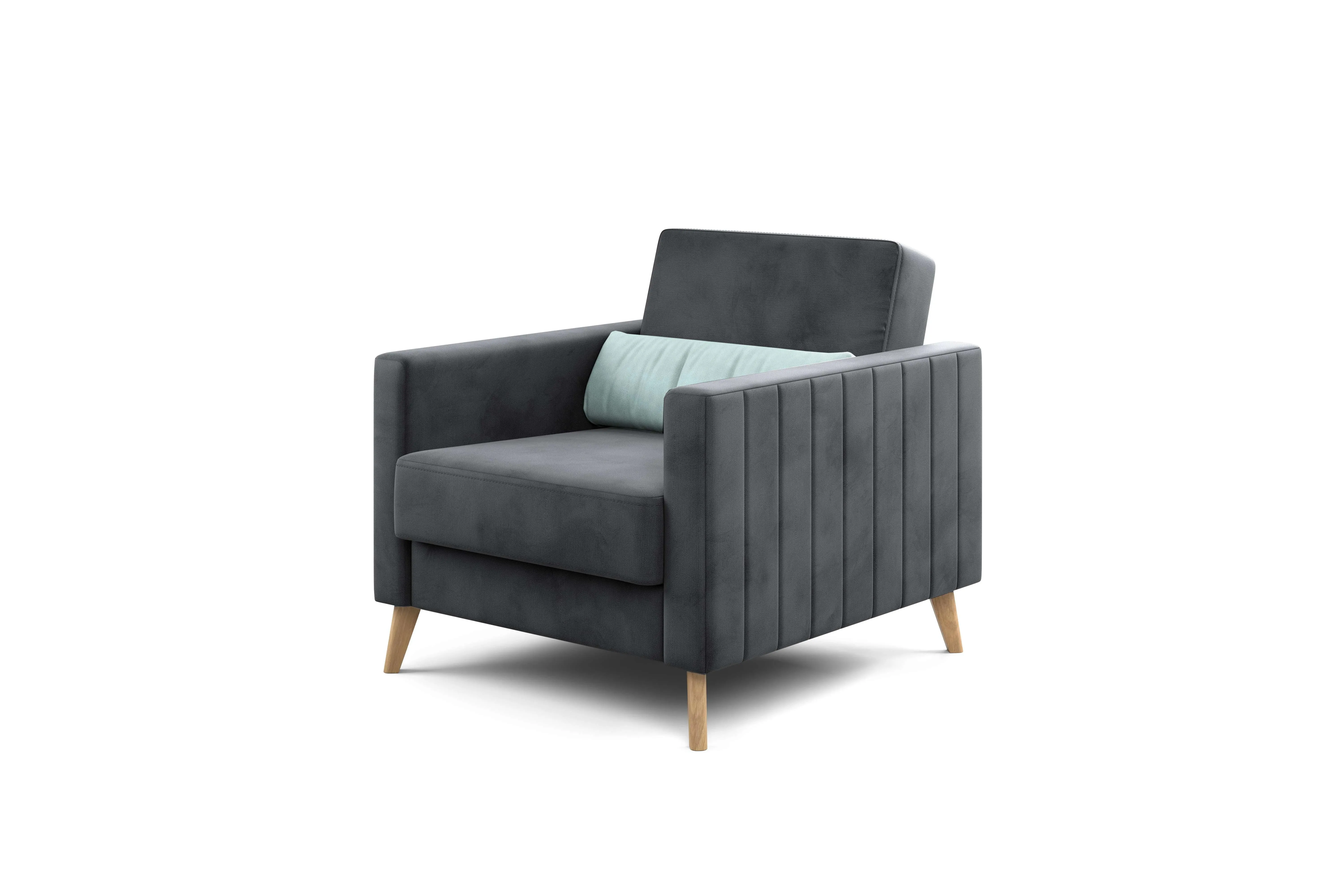 Кресло имеет простой и элегантный силуэт. Обивка из велюра не только роскошно выглядит, но еще и практична в эксплуатации, а также имеет отличные показатели износоустойчивости. Высокие опоры из массива березы придают креслу визуальную лёгкость, декоративная отстрочка на боковинах придает приятный объем. Подушки из велюра контрастного цвета входят в комплект.