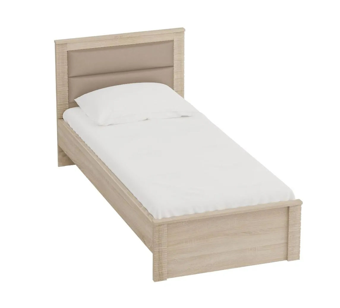 Кровать оснащена мягким изголовьем, состоящим из четырёх элементов, обтянутых экокожей.
