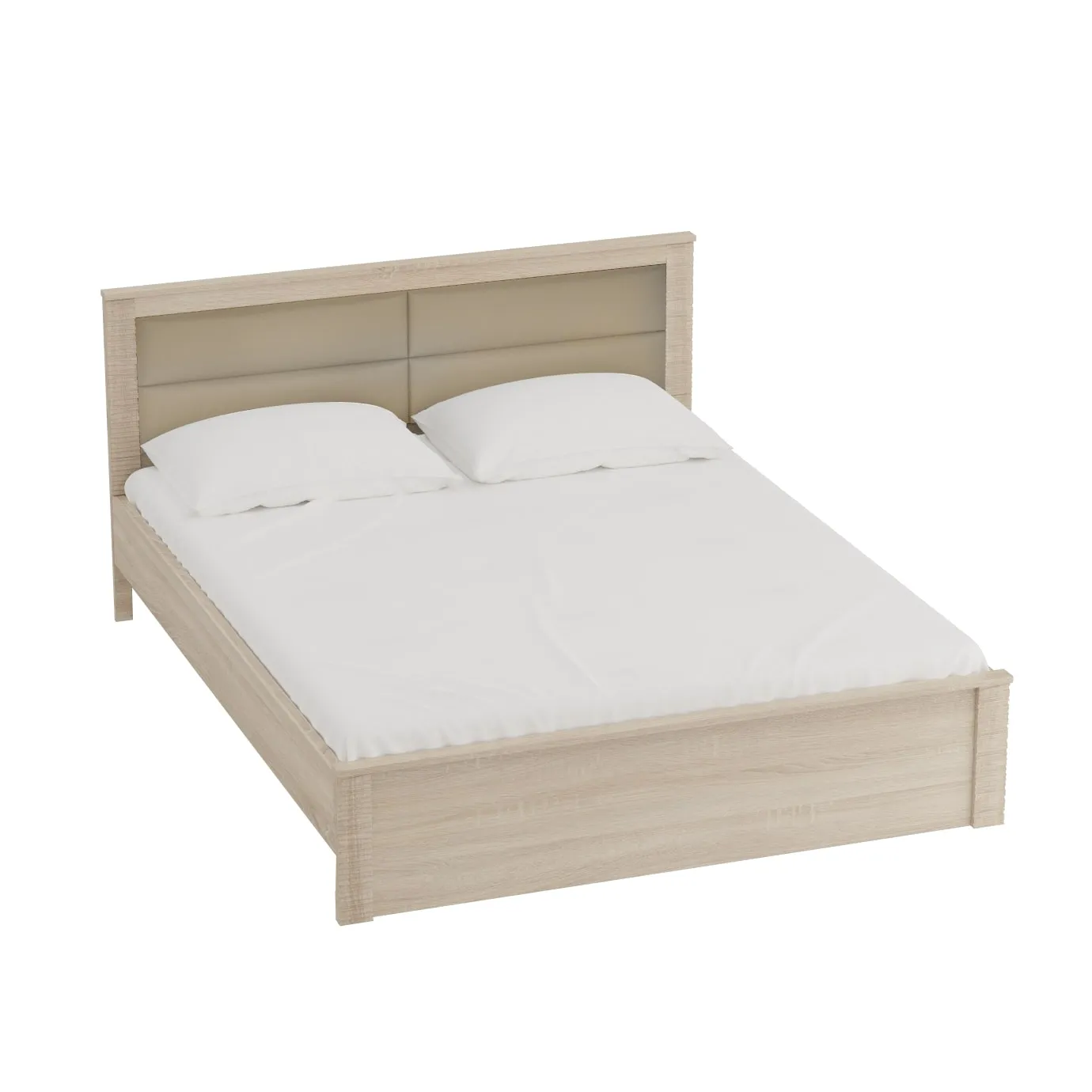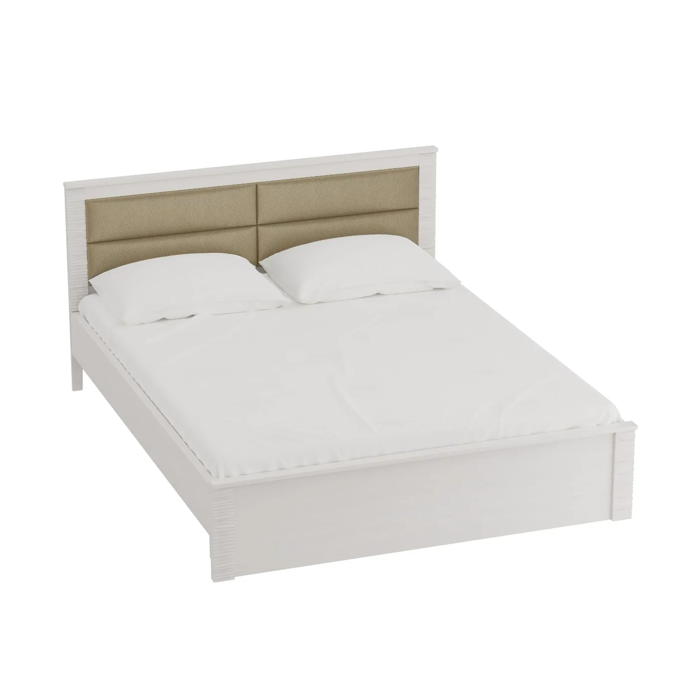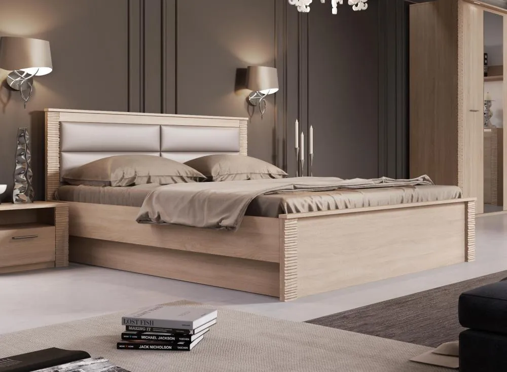 Кровать оснащена мягким изголовьем, состоящим из четырёх элементов, обтянутых экокожей.