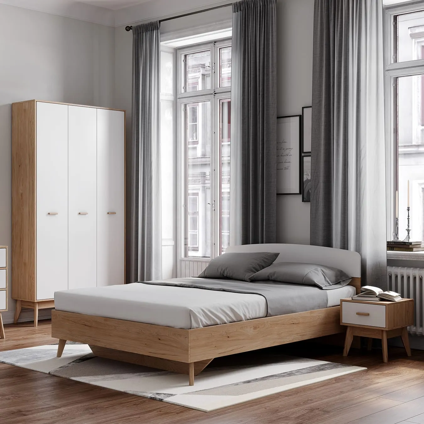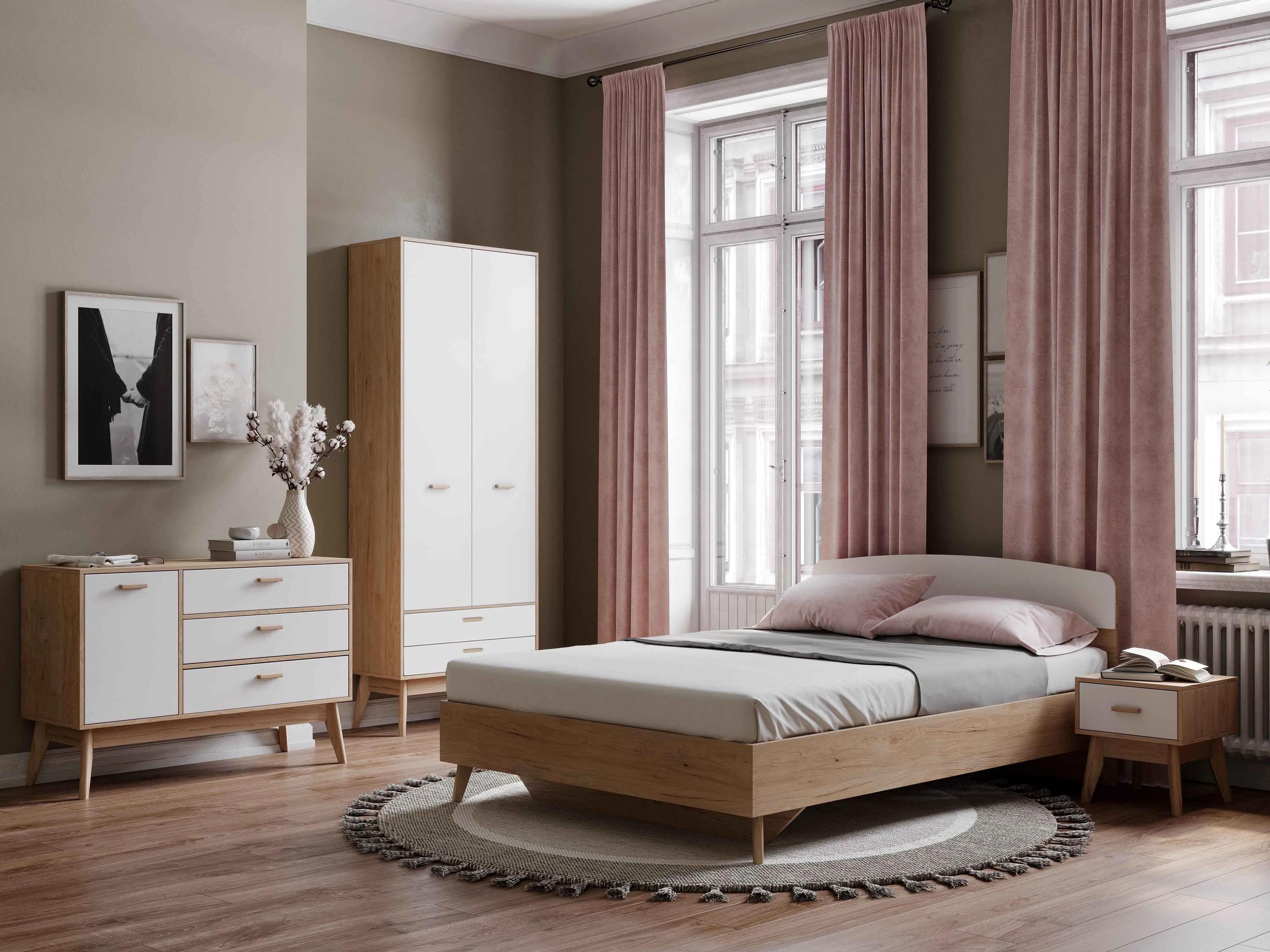 Корпус изготовлен из ЛДСП толщиной 16 мм в цвет натурального дуба, белая накладка в изголовье - из МДФ толщиной 16 мм. Опоры сделаны из натурального массива березы. Высота опор 25 см. Высота спального места 38 см. Рекомендуемая высота матраса 16-25 см. В комплект кровати входит прочное ортопедическое основание на березовых ламелях. Максимальная нагрузка на одно спальное место составляет 150 кг.
