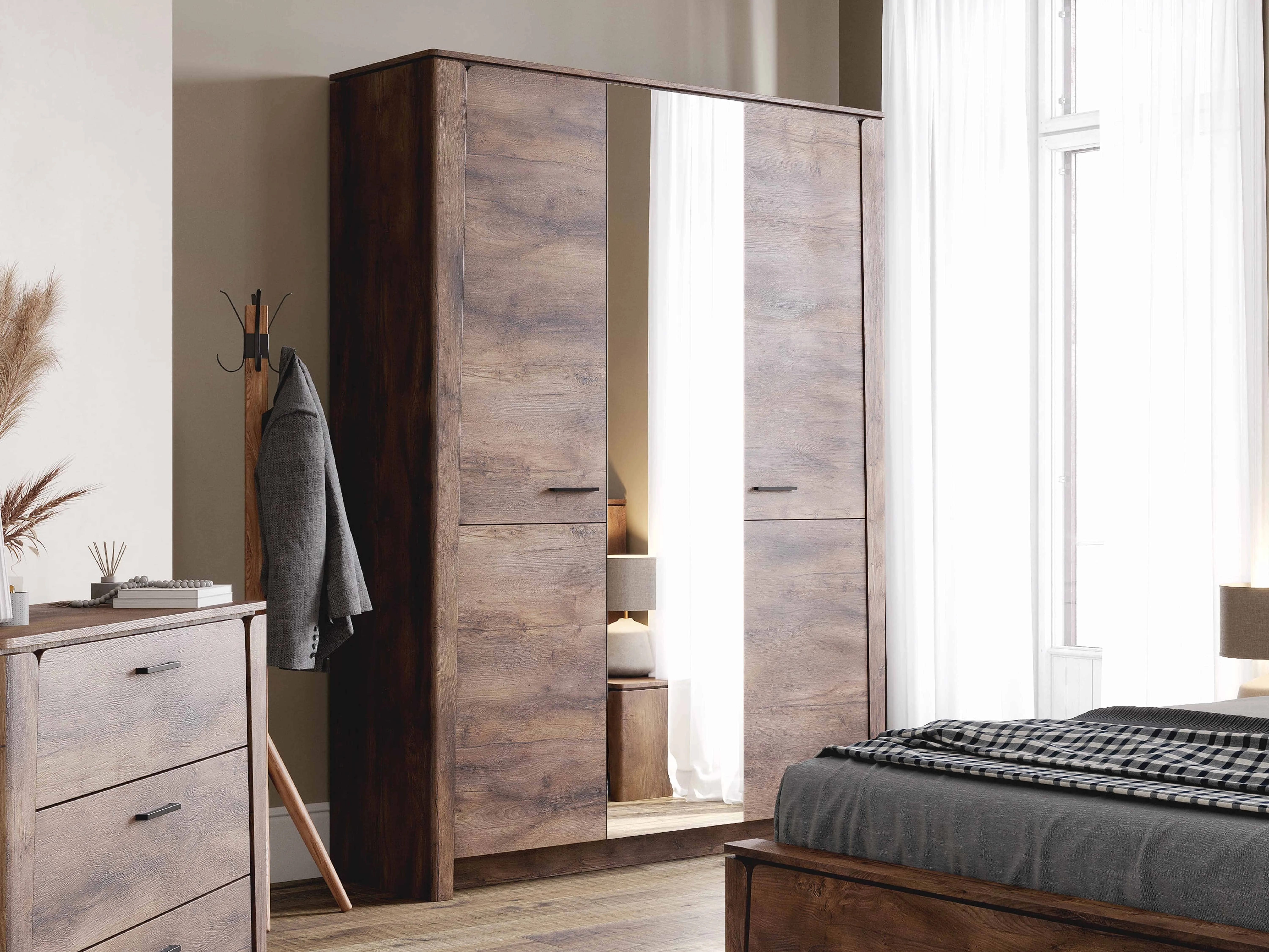 В состав гарнитура входят различные элементы, которые позволят вам создать уютную спальню, такие как: шкаф двухдверный, шкаф трёхдверный, туалетный столик, комод с тремя ящиками, тумба с ящиком, кровать.
