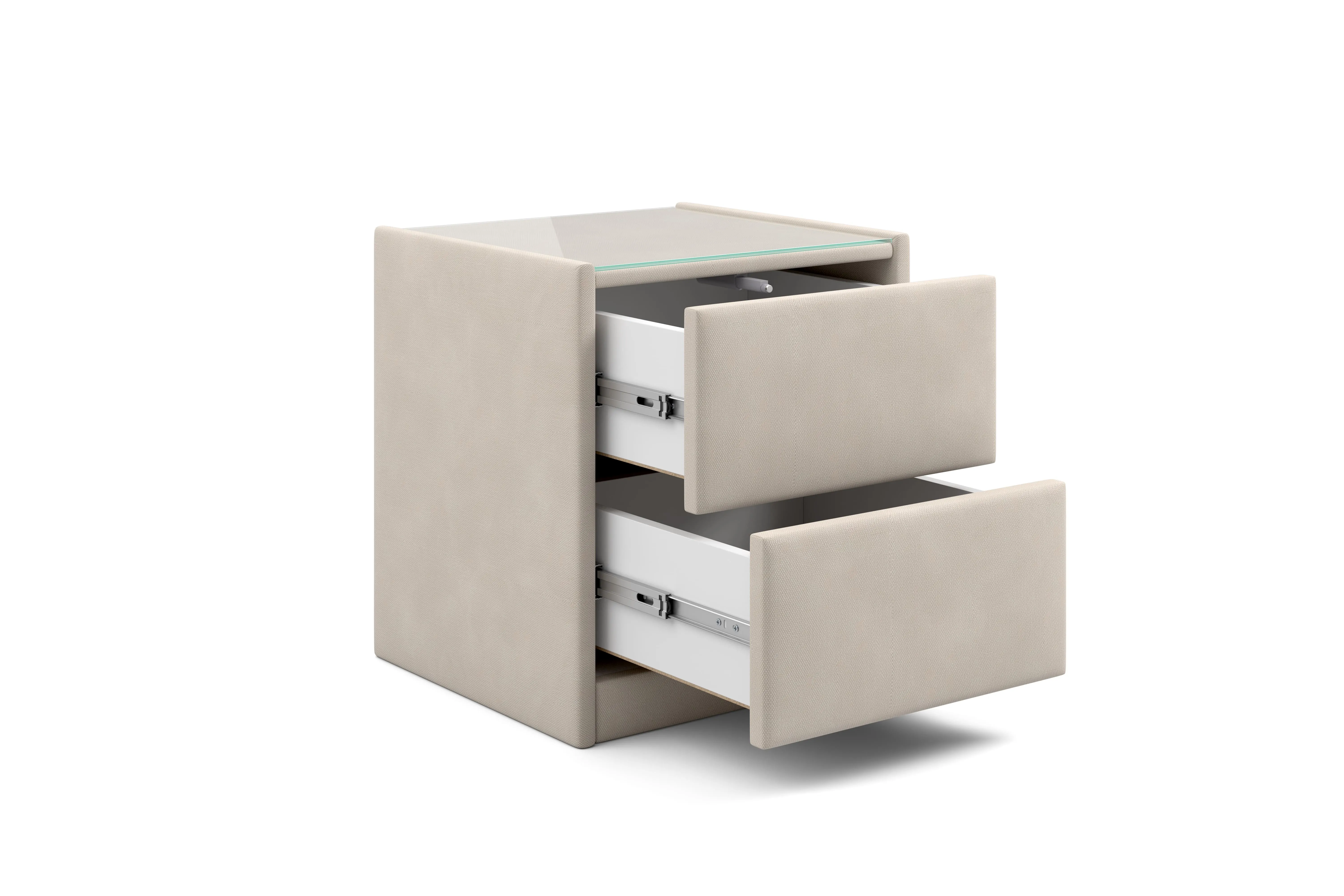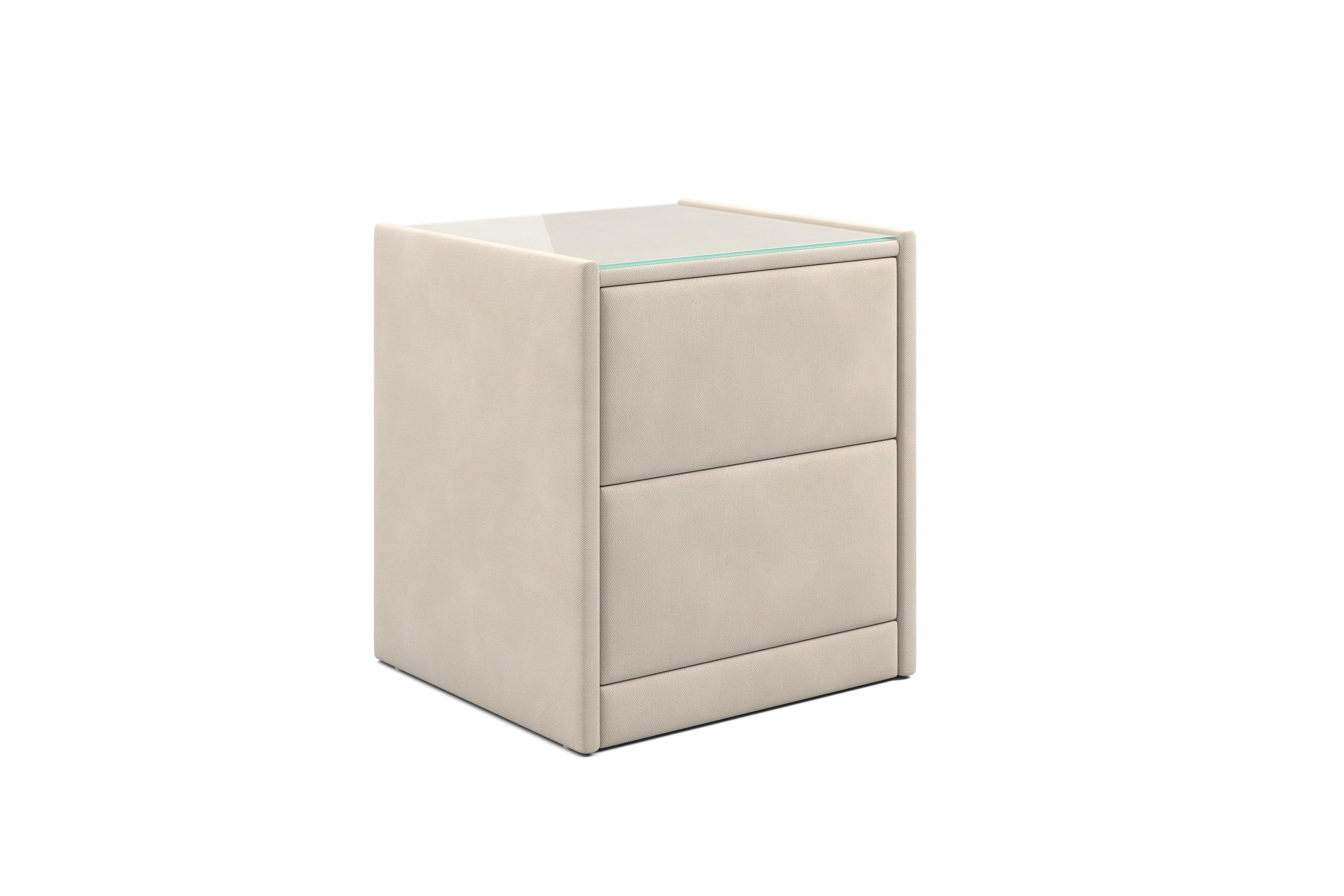 Тумба обтянута высококачественным велюром, что придает ей особый уют и комфорт. Имеет стеклянную столешницу и два вместительных выдвижных ящика с механизмом Push to open. Скругленные торцы модели, минимизируют риск удариться в темноте.