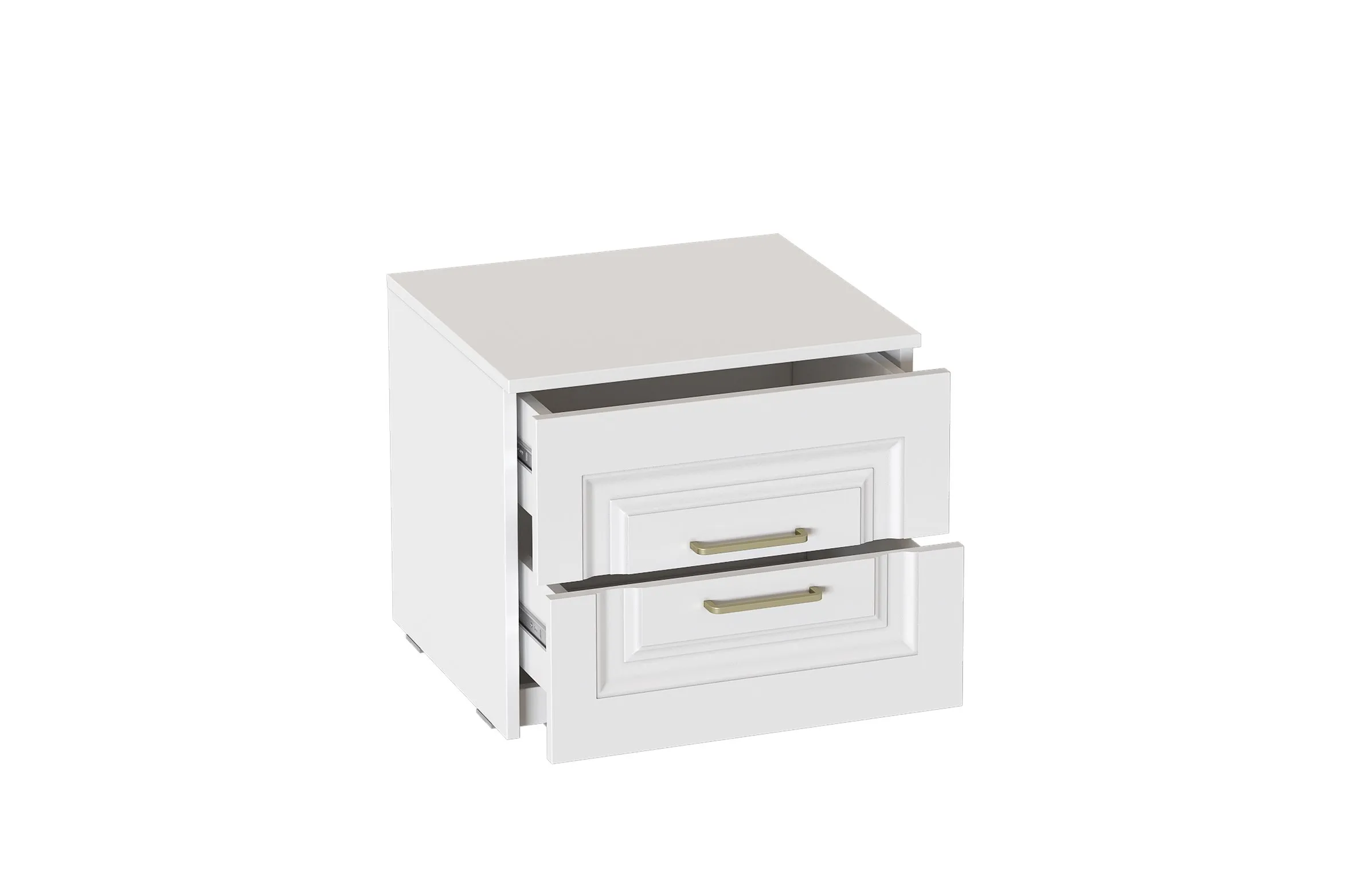 Тумба выполнена в цвете Айс 06 / Белый Аляска. Классическая фрезеровка фасадов и ручки-скобы из брашированного золота придают изделию особый шарм и элегантность. Тумба оснащена двумя ящиками полного выдвижения на шариковых направляющих, которые скользят бесшумно и плавно. Дно и задние стенки выполнены из ХДФ. На опорах размещены войлочные подпятники.