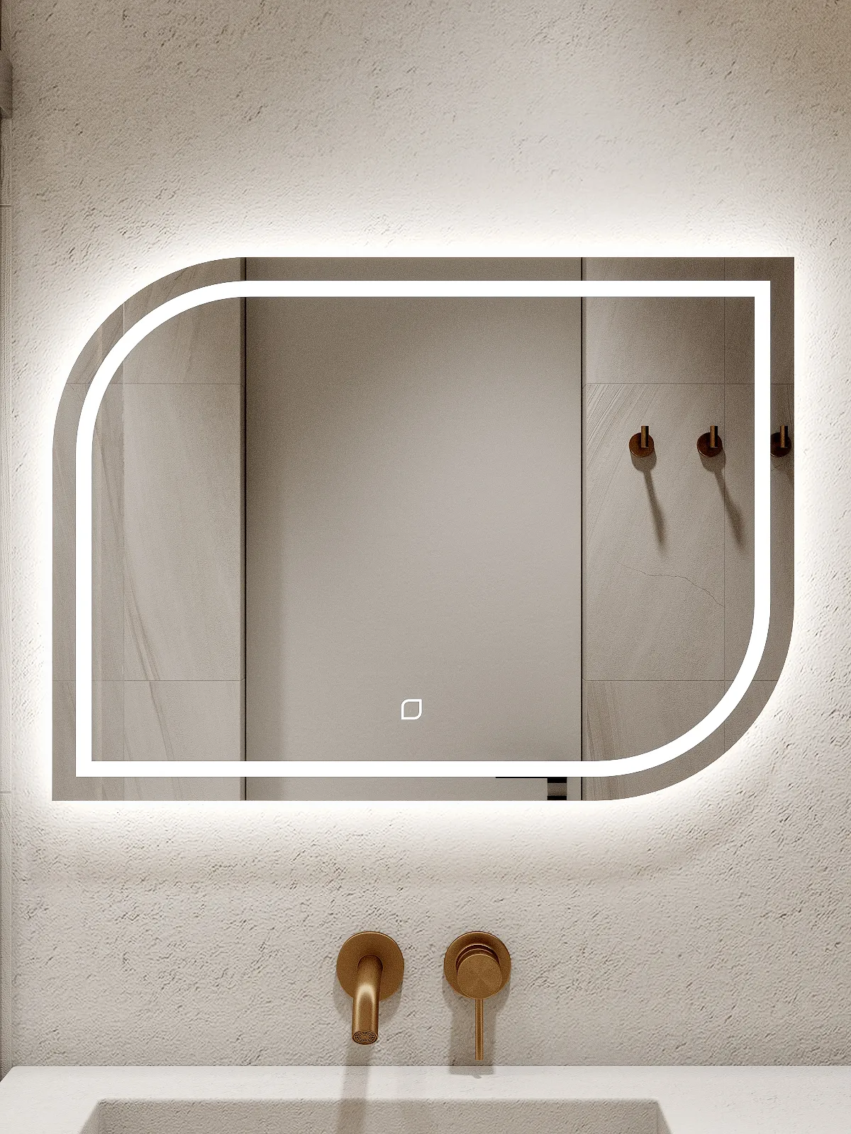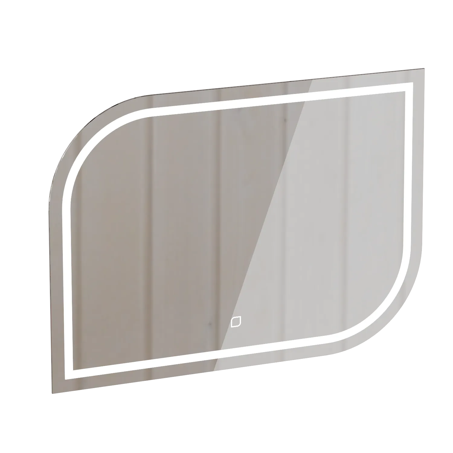 Зеркало оснащено пластинами для крепления к стене и светодиодной лентой с выключателем, срабатывающим от прикосновения. Дюбель-гвоздь покупатель приобретает отдельно, исходя из материала стен.